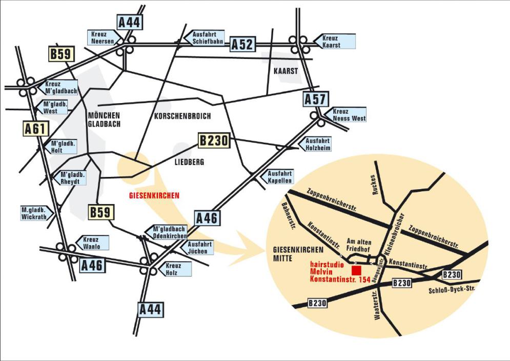 ab der Autobahnausfahrt Holzheim / Skihalle auf die B 230, ca. 10 km geradeaus. Hinter dem Ortsteil Giesenkirchen-Schelsen: Gabelung (Tankstelle), rechts auf die Zoppenbroicher Straße. An der nächsten Ampelkreuzung links auf die Kleinenbroicher Straße. Im Kreisverkehr 1. Straße rechts auf die Kleinenbroicher Str. und sofort rechts - Am Alten Friedhof. An der (nach rechts abknickenden) Vorfahrt links auf die Konstantinstraße abbiegen bis Nr. 154.